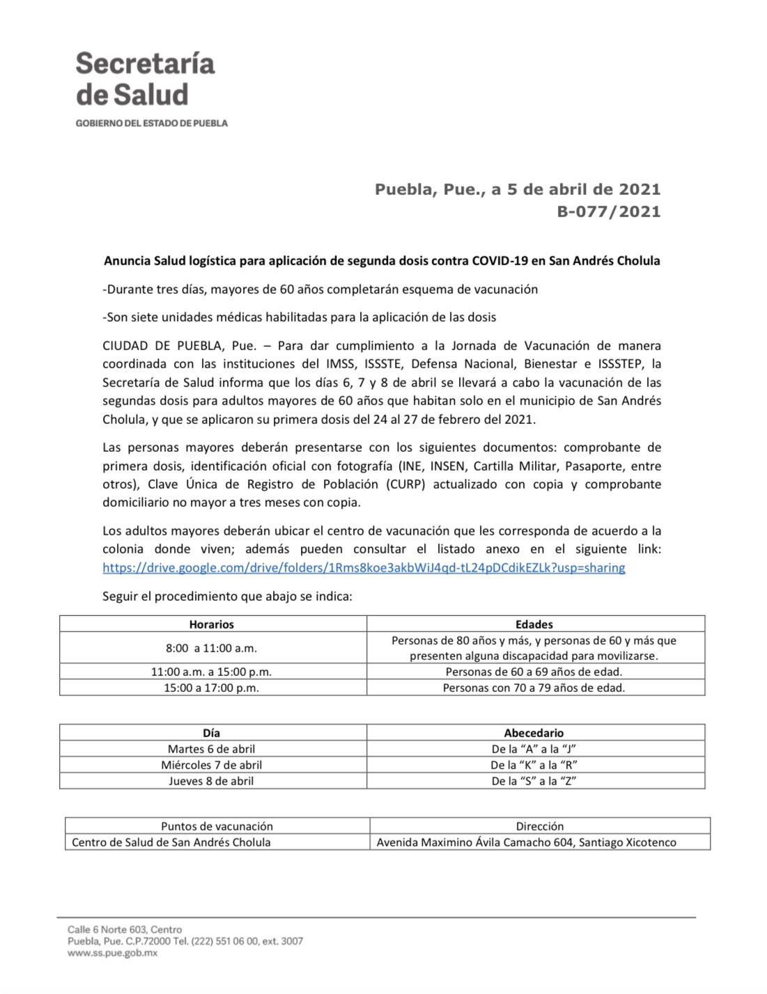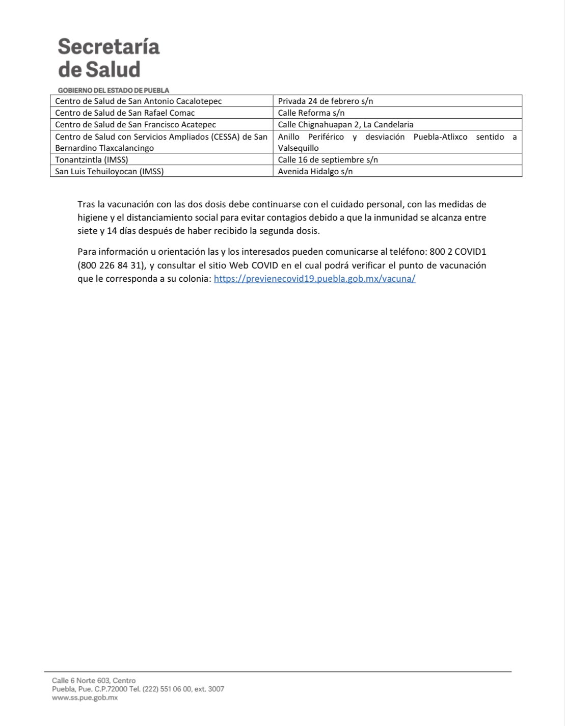 Iniciará en San Andrés Cholula aplicación de segunda dosis contra COVID-19