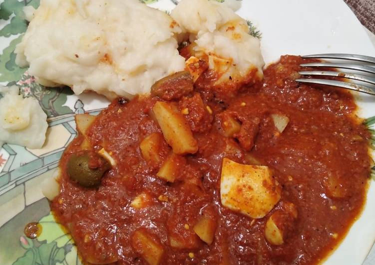 1.- Disolver el recado con el vinagre y luego remojar la carne de puerco. Cortar las papas en cuadritos y picar la cebolla en cuadritos y el ajo, sancochar los huevos como 30 minutos junto con el tomate, el puré de tomate. Agregar las aceitunas picadas.