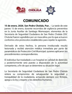 San Pedro Cholula.- La tarde de este jueves 15 de enero, durante recorridos de vigilancia preventiva en la Junta Auxiliar de Santiago Momoxpan, elementos de la Secretaría de Seguridad Ciudadana de San Pedro Cholula (SSC Cholula) fueron agredidos por un masculino, por lo que actuaron conforme a los protocolos establecidos para repeler la agresión.