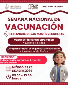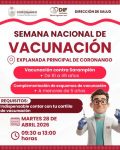Coronango.- Como una medida de protección y para acercar la atención médica, el Ayuntamiento de Coronango, el DIF Municipal y la Dirección de Salud participarán en la Semana Nacional de Vacunación 2026 con dos módulos.