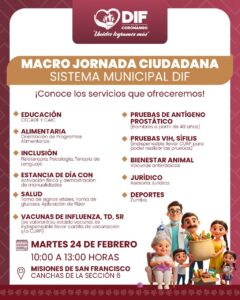Coronango.- Para acercar los servicios a la población, el Sistema DIF Municipal de Coronango realizará una «Macro Jornada Ciudadana» en la sección 6 de Misiones de San Francisco.