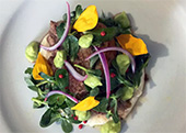 Costilla sin hueso sobre cama de bechamel Ensalada de verdolaga con pimienta roja