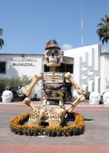 Las esculturas están adornadas con flores de cempasúchil, y buscan invitar a la reflexión, al disfrute en familia y a mantener viva la memoria de nuestros ancestros.