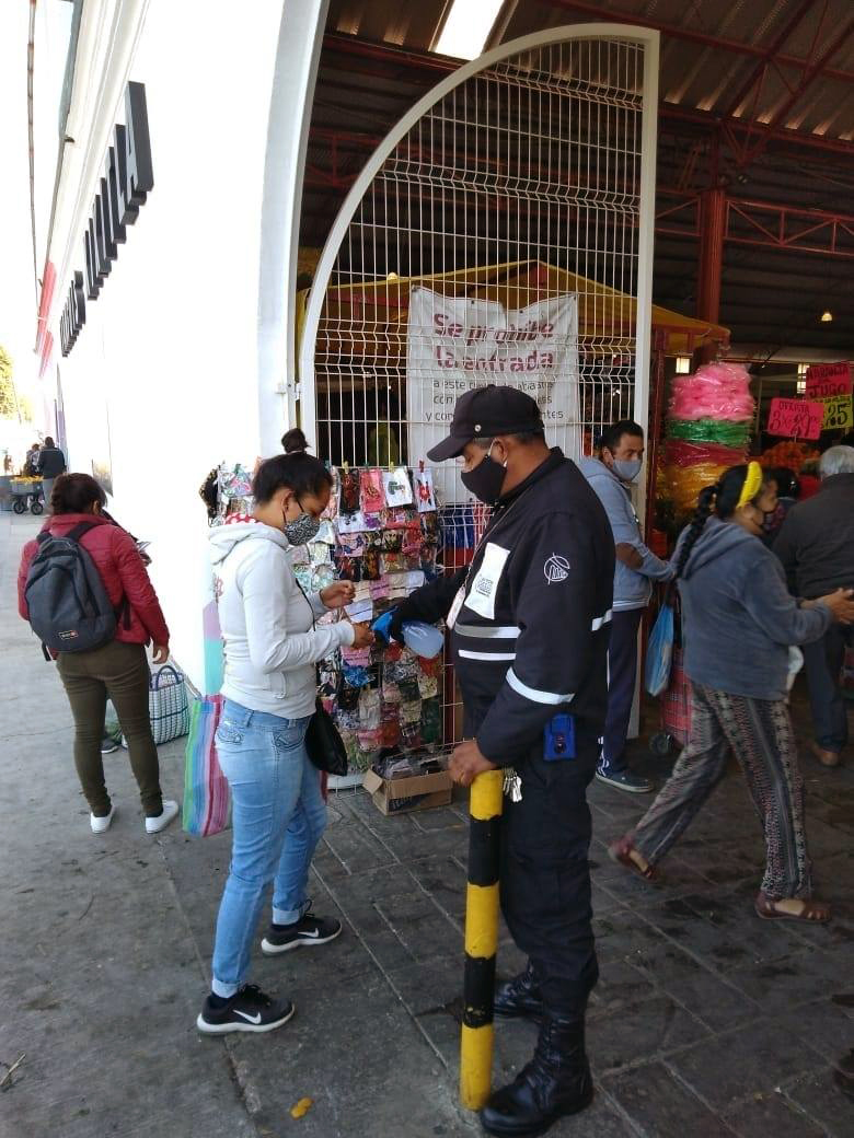 Los clientes deben de pasar usando de manera correcta el cubre-boca, si no lo llevan así, les invitan a ponérselo, si no tienen les regalan uno, y si se niegan a usarlo, entonces se les empieza a negar el acceso, para no poner en riesgo a nadie. Los comerciantes en su generalidad, también lo usan, cuando no es así, el personal de Protección Civil, aplica la misma medida que con los clientes.