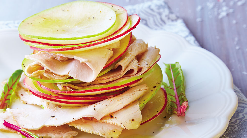 1.- Coloca todos los ingredientes de la vinagreta en un tazoìn y mezcla con un batidor hasta formar una emulsión. Reserva. 2.- Forma cuatro torres con las manzanas y las rebanadas de pechuga de pavo, intercalaìndolas. 3.- Sirve una torre por cada plato. BanÞa con la vinagreta y decora con las hojas de betabel.