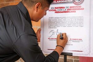 Cuautlancingo.- El edil de Cuautlancingo, Omar Muñoz, firmó un convenio de colaboración con la Universidad Mesoamericana de Puebla para que los estudiantes realicen su servicio social y prácticas en las dependencias del gobierno municipal, lo que reafirma su compromiso con el desarrollo educativo de los jóvenes de la demarcación y del estado.