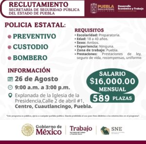 A realizarse el 26 de agosto de 9:00 a.m. a 3:00 p.m. en la Explanada municipal, se ofertarán 589 plazas para integrarse a la Secretaría de Seguridad Pública como policía estatal preventivo, custodio y bombero.