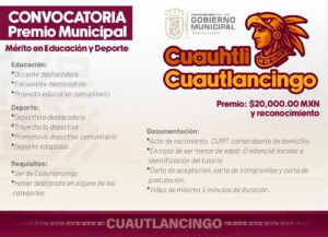 Cuautlancingo.- El gobierno municipal invita a la ciudadanía a participar en la convocatoria para obtener el “Premio Cuauhtli Cuautlancingo”, con el que se reconocerá el mérito de quienes han sobresalido en los ámbitos educativo y deportivo en la comunidad.