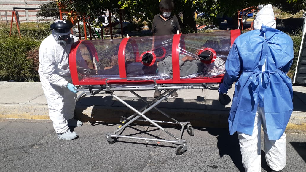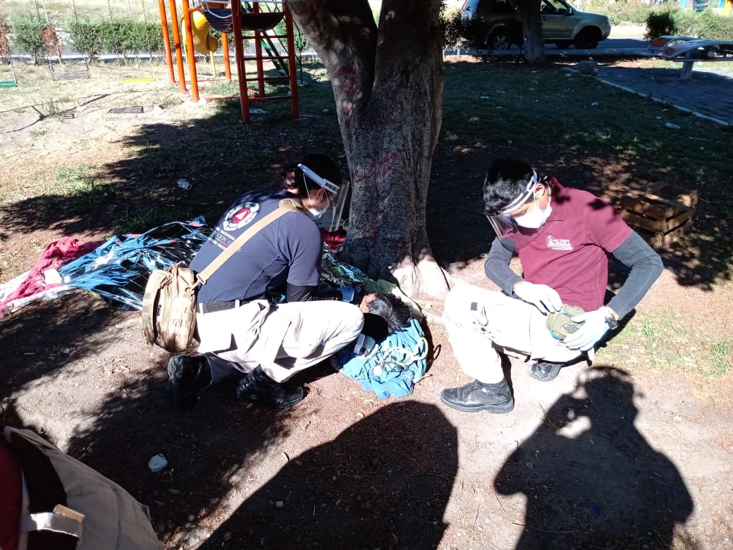 Tras tomarle sus signos vitales y valorarlo, pudieron determinar que presentaba el cuadro de posible contagio de Covid-19, además de un avanzado estado de desnutrición, por lo cual se pidió el apoyo de SEMECAM, institución que cuenta con camilla con burbuja, especializada para traslado de pacientes Covid-19.