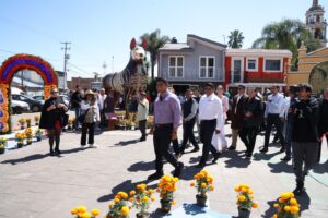 Posteriormente, los asistentes se trasladaron a la Casa del Campesino, flanqueados por los integrantes de la “Danza de los Diablitos”, grupo artístico del Instituto Jaime Torres Bodet, para visitar la ofrenda monumental y la exposición “Intervención de cráneos”.