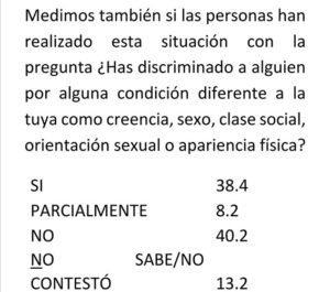 Medimos también si las personas han realizado esta situación con la pregunta ¿Has discriminado a alguien por alguna condición diferente a la tuya como creencia, sexo, clase social, orientación sexual o apariencia física?
