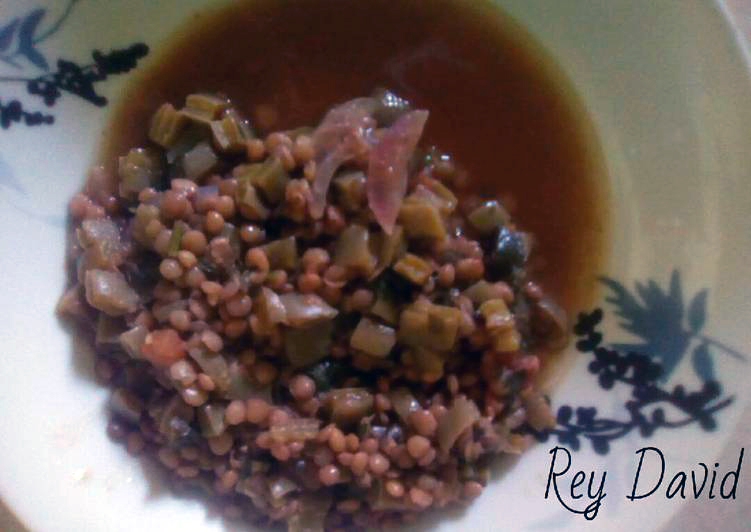 1.- Se hierven las lentejas en agua y sal. 2.- En una sartén se pone poquito aceite y se fríen el tomate y la cebolla. 3.- Cuando ya están sazonamos tomate y cebolla se le ponen el nopal en cuadritos y se guisan. 4.- Cuando están guisados los nopales se le agregan las lentejas con todo y el caldo. 5.- Se le agrega el Cilantro y un poco de más sal