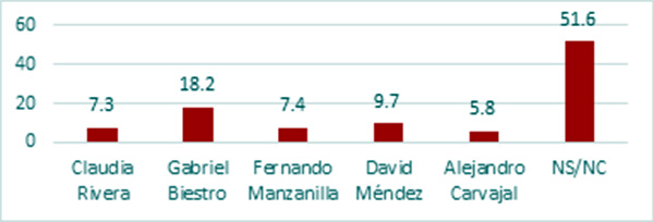 En otra pregunta cuando cuestionamos a las personas que votarían por MORENA o simpatizan con este partido el cuestionamiento fue ¿quién sería el mejor candidato de MORENA para la presidencia municipal de Puebla?, los números fueron para Claudia Rivera fue 7.3%, para Gabriel Biestro fue 18.2 por ciento, para Fernando Manzanilla 7.4 por ciento David Méndez 9.7 por ciento, 5.8 por ciento para Alejandro Carvajal y un 51.6 por ciento No sabe o No contestó.