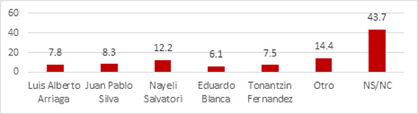 Posteriormente en otra pregunta de la misma encuesta preguntamos ¿Quién sería el mejor candidato de MORENA para presidente municipal de San Pedro Cholula? La respuesta fue Luis Alberto Arriaga 7.8%, Juan Pablo Silva 8.3 por ciento, Nayeli Salvartori 12.2 por ciento, Eduardo Blanca 6.1 por ciento, Tonantzin Fernández 7.5 por ciento, Otro 14.4 por ciento y 43.7 No Sabe o No Contestó .