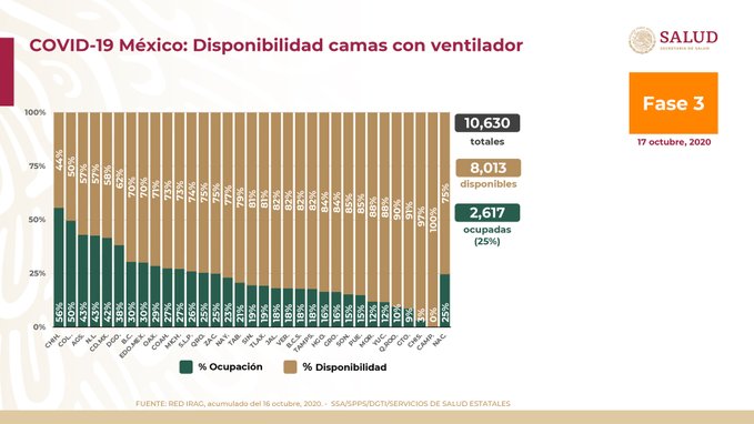 Se trata de Chihuahua con el 59% de la ocupación hospitalaria, seguido por Nuevo León que cuenta con el 57 por ciento y Durango con un 53 por ciento de ocupación hospitalaria. En cuanto a los estados con menor número de pacientes hospitalizados, destacan Campeche y Chiapas con el 5 y 4 por ciento, respectivamente.