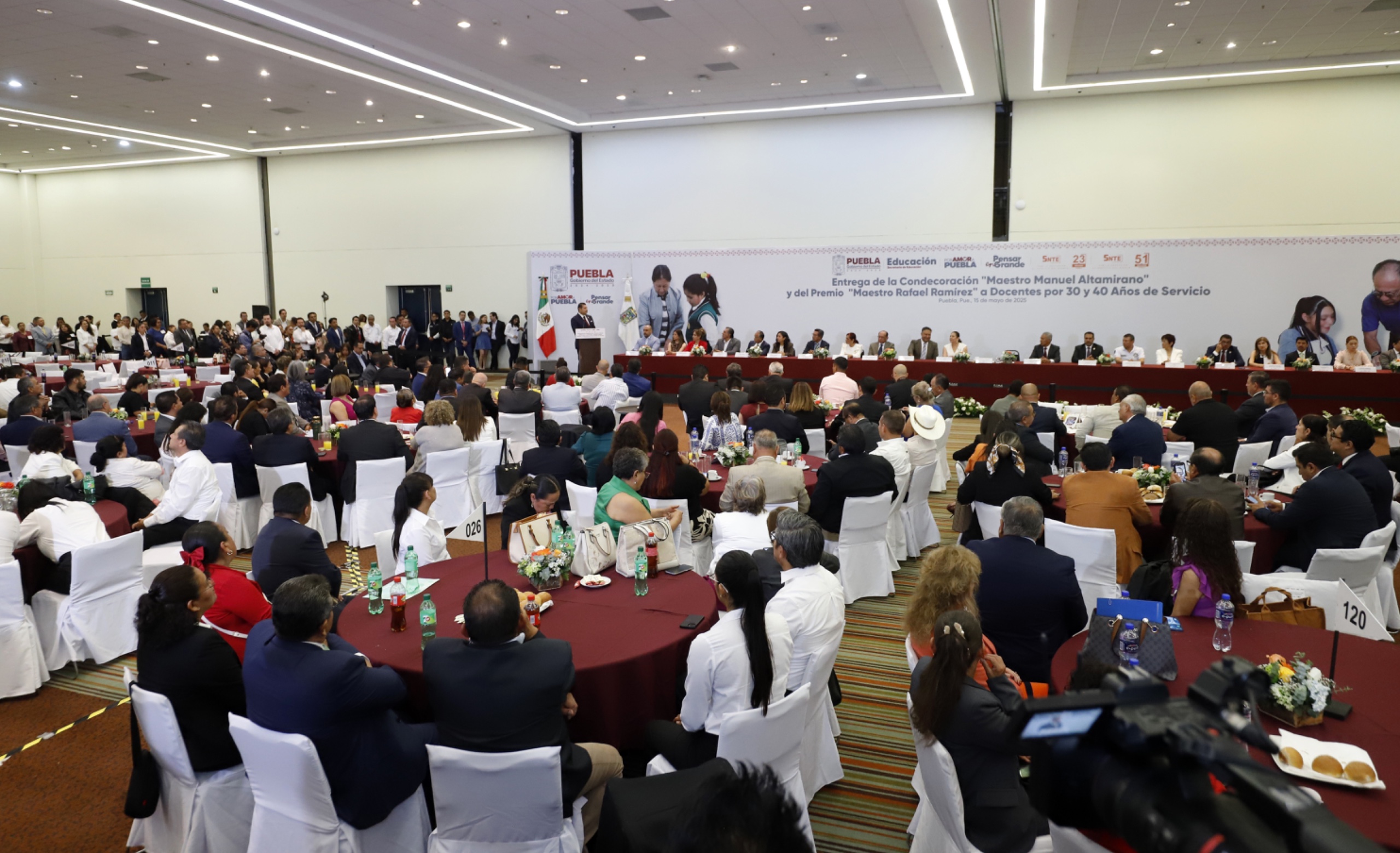 CIUDAD DE PUEBLA, Pue.- Con la reconstrucción del CAPCEE se apoyará más a las escuelas, con la auditoría del ISSSTEP se atenderá con dignidad a los maestros y con el Programa de Obra Comunitaria se apoyará con paneles solares a las instituciones educativas, afirmó el gobernador Alejandro Armenta, al entregar la Condecoración «Maestro Manuel Altamirano por 30 años de servicio y el premio «Maestro Rafael Ramírez», por 40 años de trabajo a profesores del estado.