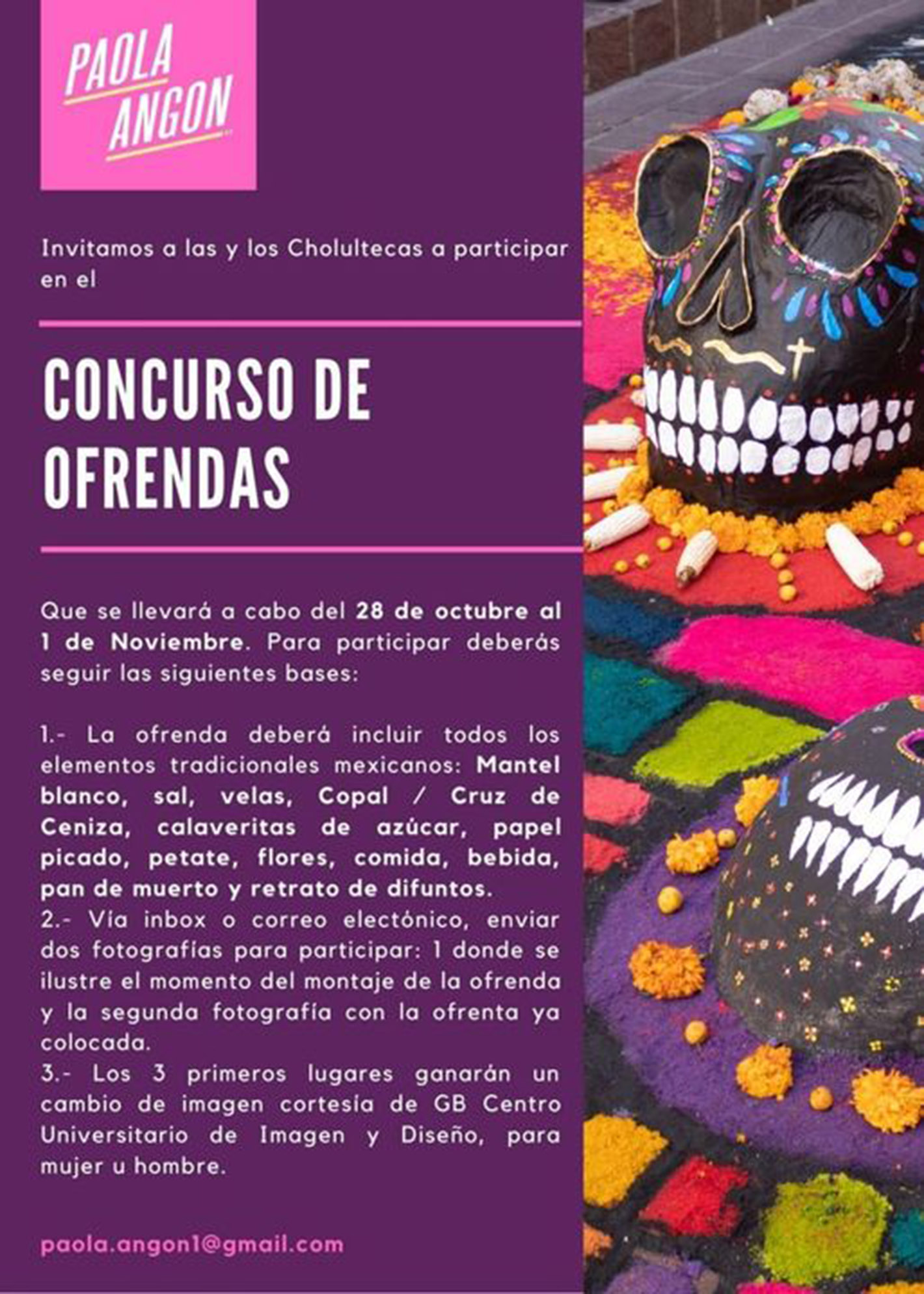 Es muy sencillo participar, una vez que esté listo el altar, solo se le toma una fotografía y se manda por inbox, a mi Facebook, o bien al correo paola.angon1 y listo. Quién gane, tendrá su premio un tratamiento para cambiar su imagen, o a la persona que se indique”.
