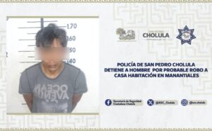San Pedro Cholula.- Derivado de una oportuna intervención, elementos de la Secretaría de Seguridad Ciudadana de San Pedro Cholula (SSC Cholula) detuvieron a un hombre por su probable participación en el delito de robo a casa habitación, en la Junta Auxiliar de Rafael Ávila Camacho (Manantiales).