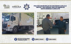 San Pedro Cholula.- Como parte de las acciones de seguridad implementadas por el Gobierno Municipal de San Pedro Cholula, elementos de la Secretaría de Seguridad Ciudadana (SSC Cholula) lograron ubicar y recuperar un tractocamión que había sido reportado como irregular en su ruta.