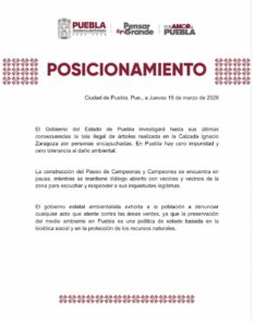 Puebla.- El Gobierno del Estado de Puebla investigará hasta sus últimas consecuencias la tala ilegal de árboles realizada en la Calzada Ignacio Zaragoza por personas encapuchadas. En Puebla hay cero impunidad y cero tolerancia al daño ambiental.