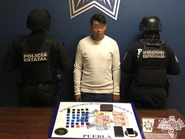 CHOLULA.- Un presunto distribuidor de droga identificado como Alejandro Á., alias “El Alex”, de 22 años, fue detenido por agentes de la Policía Estatal en inmediaciones de la junta auxiliar Santiago Momoxpan.