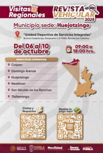 Huejotzingo.- La Secretaría de Movilidad y Transporte llevará a cabo el programa de Revista Vehicular 2025 en Huejotzingo, servicio que estará disponible del 6 al 10 de octubre, en un horario de 9:00 a 18:00 h, en la Unidad Deportiva de Servicios Integrales (Bulevard Huejotzingo, Aeropuerto, Rancho «Los Caballos»).