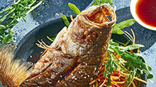 1.- Calienta el azúcar con el vinagre y soya. Retira cuando esté disuelta el azúcar y enfría. Marina la zanahoria con el pepino durante media hora y escurre. 2.- Coloca el pescado en una charola y salpimenta. Rebosa con fécula de papa y fríe en aceite caliente; retira cuando dore. 3.- Sirve sobre los vegetales marinados, agrega hojas de crisantemo y termina con ajonjolí. Acompaña con salsa de habanero.
