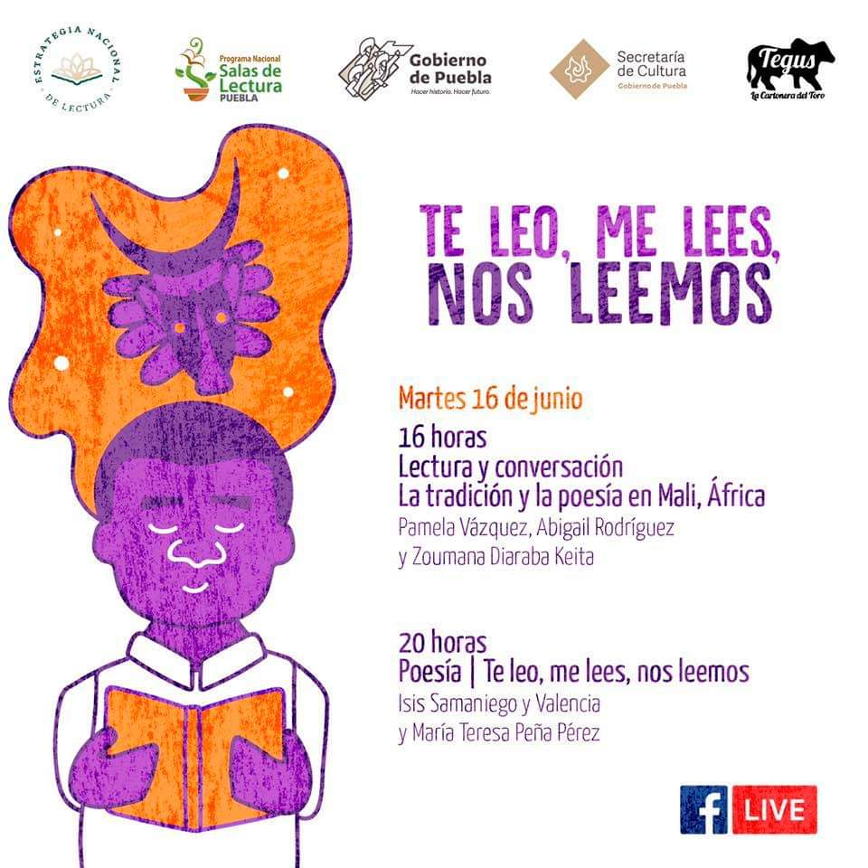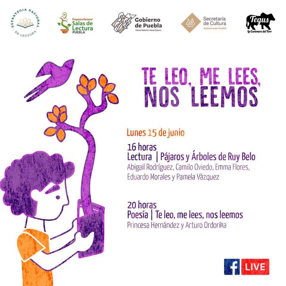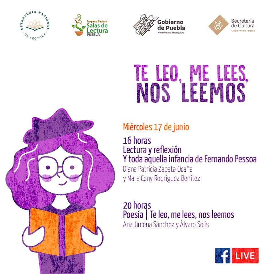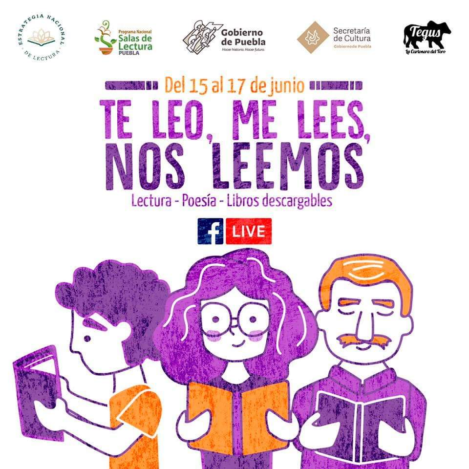PUEBLA.- En el marco de la celebración por el Día Municipal de la Lectura, del 15 al 17 de junio la Secretaría de Cultura presentará "Te leo, me lees, nos leemos", programación especial a través de Facebook Live de la dependencia.
