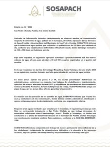 SOSAPACH refrenda su compromiso de trabajar de manera permanente en beneficio de las y los cholultecas, fortaleciendo la infraestructura hidráulica y la atención a las personas usuarias, bajo una política de transparencia y responsabilidad en el manejo del agua.