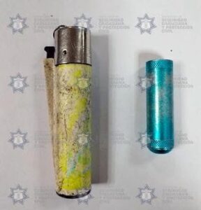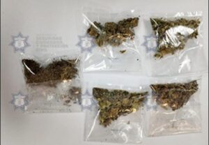 Durante la inspección preventiva, se le localizaron entre sus pertenencias cinco bolsas de plástico transparente que contenían hierba seca con características similares a la marihuana, así como un encendedor y un objeto metálico.