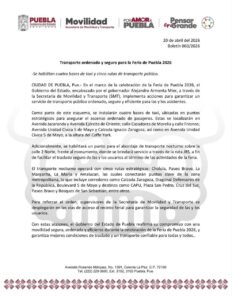 Con estas acciones, el Gobierno del Estado de Puebla reafirma su compromiso con una movilidad segura, ordenada y eficiente durante la celebración de la Feria de Puebla 2026, y garantiza mejores condiciones de traslado y un transporte confiable para todas y todos.
